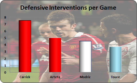 Clearly, Carrick is making the biggest contribution here. He is United’s defensive anchor. Modric and Toure have players alongside them in Parker and Barry that will do the majority of the dirty work for them. Arsenal’s stats suggest Arteta and Song equally share defensive responsibility. Already we begin to see the different roles each are playing.