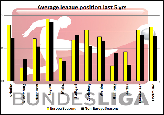 The Bundesliga sees its teams suffer the least apparent impact overall from the Europa League but it contains possibly its worst victim: