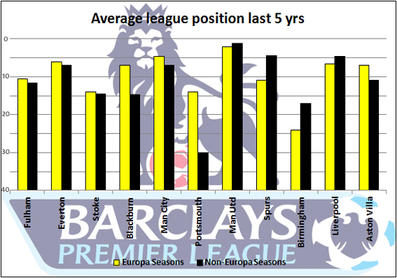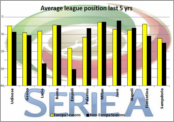Napoli finish a massive half a position lower on average (7th to 7.5th) in their Europa seasons. Again, they’re another team whose best recent finish (3rd) has come during a Europa League campaign.