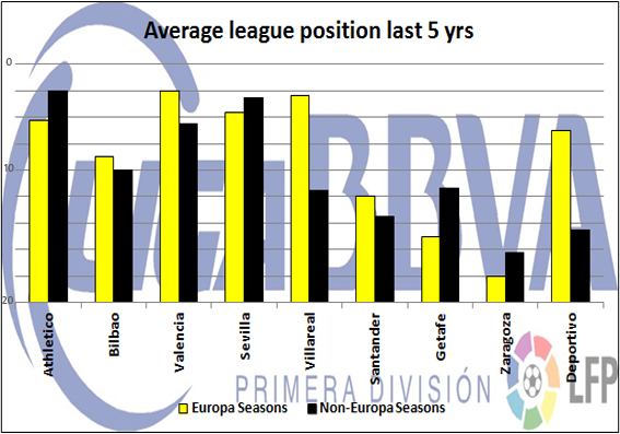 Sevilla this season played just two games in the Europa League after getting knocked out in qualifying by Hannover. This was the lowest number of European fixtures they’d played in five years be it a Europa or Champions League season yet they finished in 9th place, bringing their average league domestic position down. Their best finish in the period (3rd) came in a Europa League season.