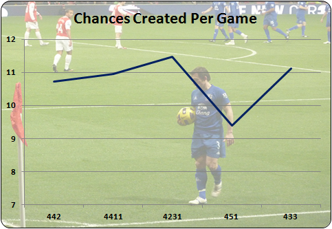 451 was a formation generally used most by sides in the bottom half of the table. Nobody would be surprised to learn that this ‘negative’ tactic makes it difficult to score goals, and just invites the opposition on – especially when you employ it against better teams than yourself.