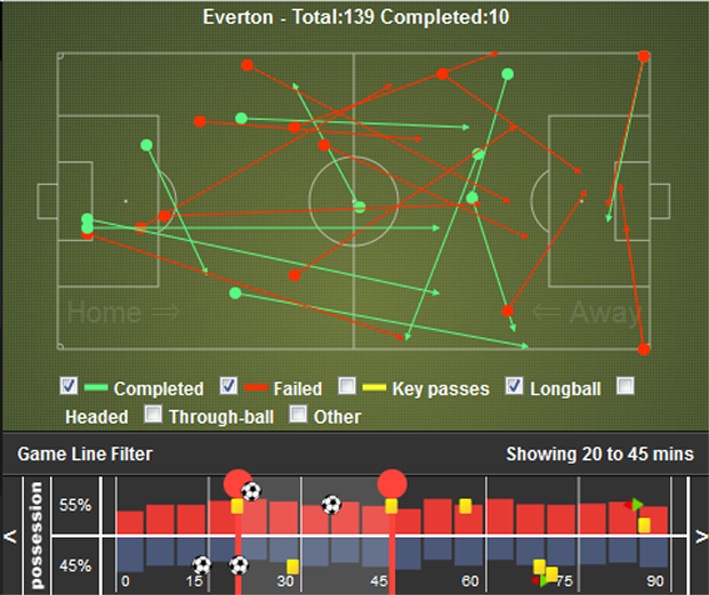 Against Everton at the weekend, Rodgers cited Everton’s direct game as the main threat towards Liverpool. However, in the 25mins that Everton dominated before half time, the below graphic shows Everton didn’t win a single long ball played centrally towards the box from deep: