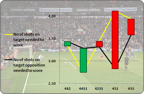 This was despite being as good a mechanism for creating chances as the other formations. However, either there was a load of bad finishing or the types of chances 433 created were poor. Why? Because it was nearly up there with 451 in terms of how many shots on target a team needed to actually score. Even though it took more shots on target to score against it too, the fact that teams playing it conceded lots of shots against them, the effect was negative. The chart below shows the goal efficiencies of the systems (big green lines = good, big red lines = bad):