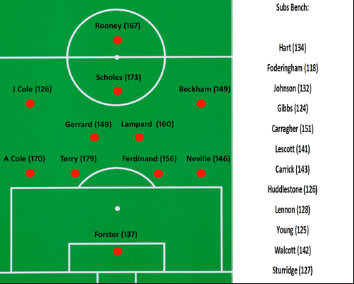 Differentgame asked Jörg to pick the optimal England squad of players still playing, based on GoalImpact. Here’s what it looks like: