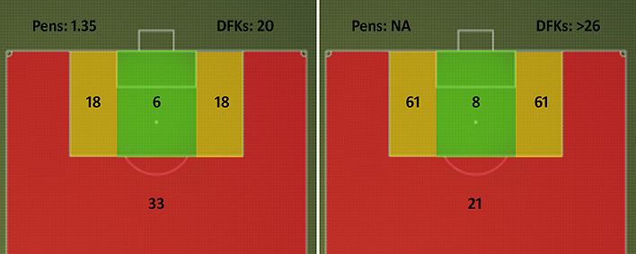 The left side of the image below shows the league average number of shots to score from the different areas. The image on the right shows how many shots it takes QPR to do so: