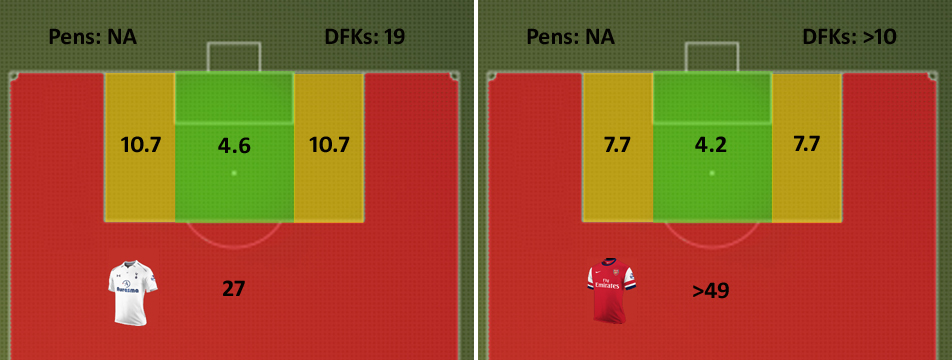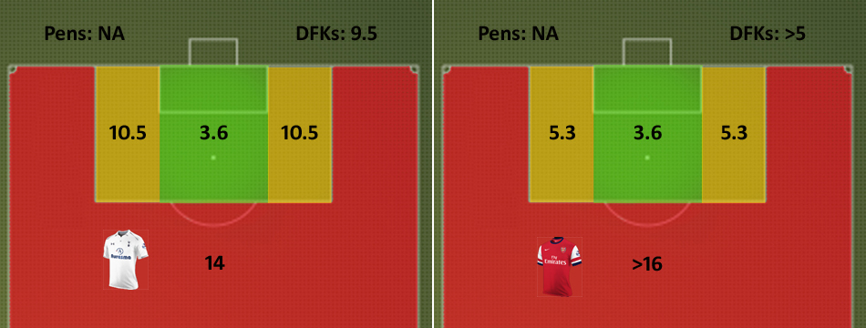 To compare the two we can SPAM both players over the last 3 Premier League seasons to find out more about their goalscoring exploits. The graphic below shows how many shots it takes each of them to score from each area: