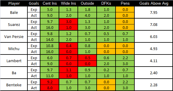 Well, our old chum Gareth Bale, comes out on top so far this season. He’s excelled in every area of the pitch – scoring above expectation from central inside the box, wide inside the box and obviously from outside the box both from open play and from free kicks. The only other player that can say the same is Robin van Persie.