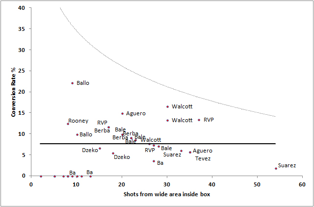 So last week at Differentgame we started to look at how repeatable a skill finishing from the central area of the box was. This week we edge further out where the angles get narrower and the shots get more speculative. Do some teams and individuals still retain that ability to regularly finish these chances? Let’s take a look.