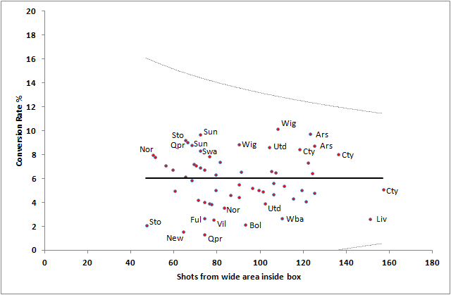 The method remains the same with data covering each of the 60 teams contesting the Premier League over the last 3 seasons. Remember we’re looking at the conversion % from the wide area inside the box for this piece. The league average is the black horizontal line through the middle. If a team’s above that line it’s a good thing, if they’re below it’s a bad thing. Simples.