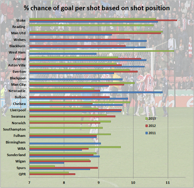 From the first graphic we can see that simply getting into decent positions does not guarantee successful conversion rates. Stoke and Reading have taken the shots from the best positions in recent times. Wolves and Blackburn are up there too. 3 of the top 5 teams who have taken shots from good areas have been relegated.