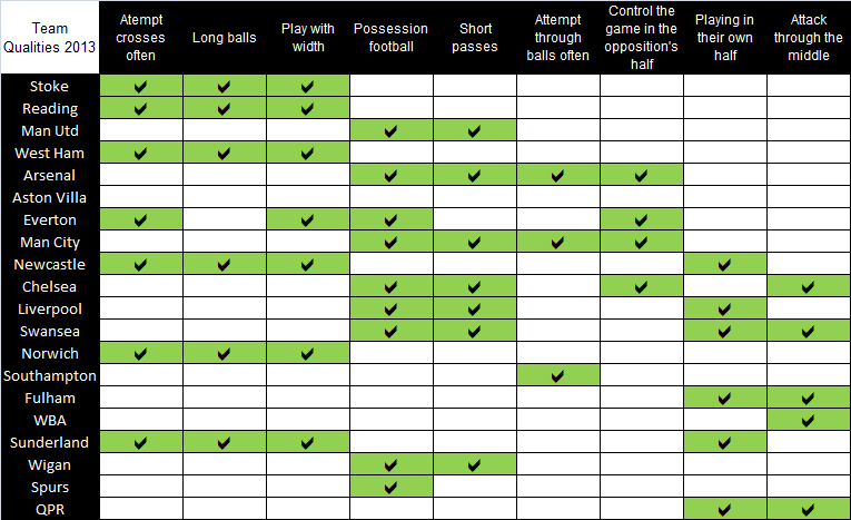 What are the best ways to get into good shooting positions? Luckily, the team pages of whoscored tells us about each side’s style. As it’s a stats site, we’re making an assumption that the styles they’ve come up with are based on stats. Putting together a matrix we can see what’s hot and what’s not: