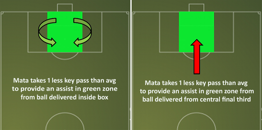 Of course Mata can do nothing if the shooter makes a hash of passes laid on a plate for him, but Chelsea as a whole were above league average at finishing chances. Also, there was next to no difference in open play conversion rate from balls Mata supplied compared to those supplied by the rest of the team as a whole.