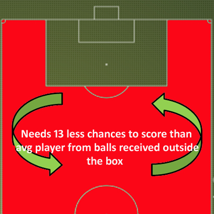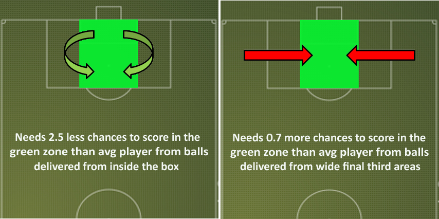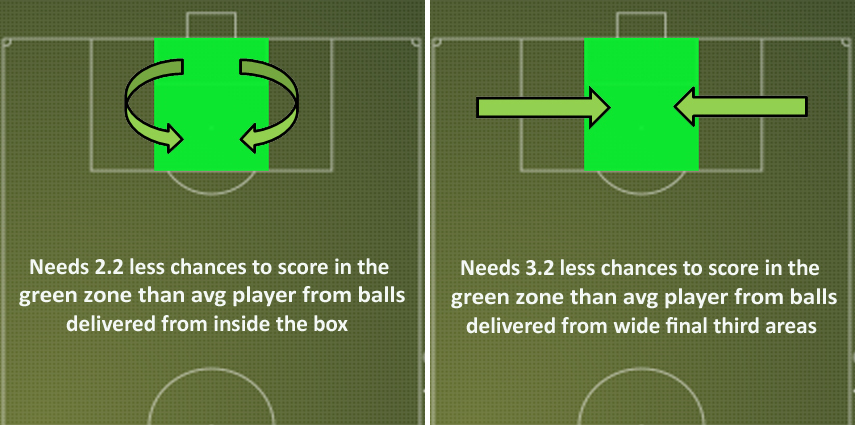 Lukaku excelled when he was teed up from inside the box itself. However, he was worse than the average player at converting crosses delivered from high wide positions. Considering this was how Everton created a huge chunk of their chances last season it looked an area of concern before he’d even kicked a ball for the Blues.