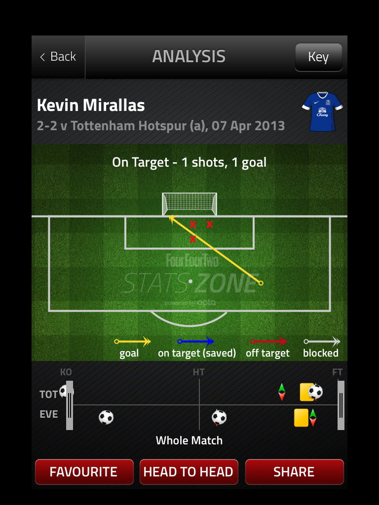 We can see that just right of the central middle zone, Lloris had a save % of 25 when the average was 76%. This looks like a pretty big hole in his game. He actually conceded 3 goals from 4 shots here. The numbers aren’t huge but there’s still something that may be gleaned. The 3 goals were against Liverpool when he came rushing out of his area to stop Downing and missed completely. The other two were slaloming efforts from Kevin Mirallas and Ramires: