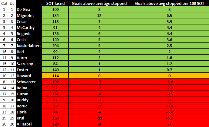 To quickly explain, SOT stands for shots on target and the final column there normalises each keeper’s opportunity to prevent goals. For example, Jussi Jaaskelainen having to make 200+ saves gives him more opportunity to prevent goals, so we’ve done it per 100 saves made to give the final rank.