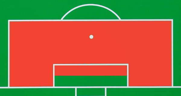 At Differentgame we call the back half of the 6 yard box (in green in the graphic below) a keepers comfort zone. This is where the overwhelming majority of saves are made. David De Gea has made this place his home. As soon as our gloved ones stray into red territory, things start to go awry.