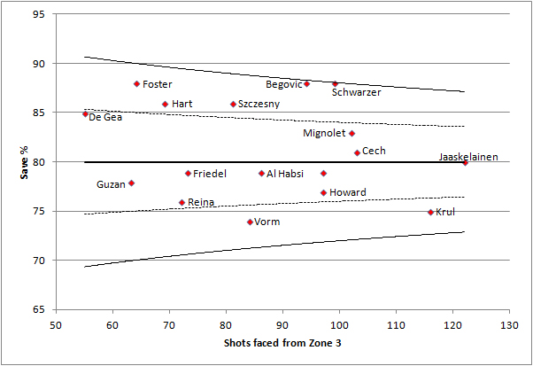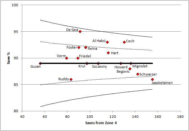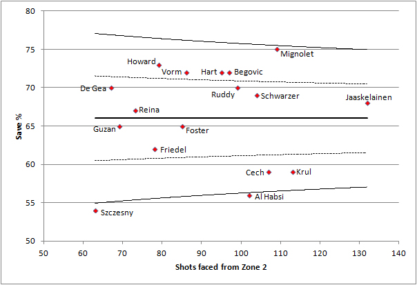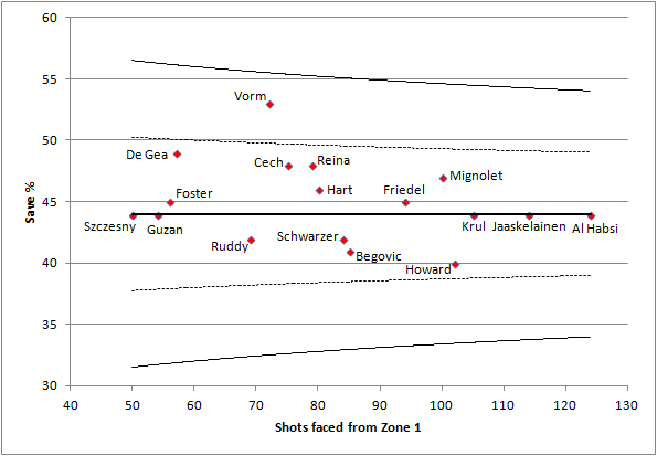Whether a keeper saves a shot on target from here is pretty much like flipping a coin. The bold straight line is the league average save %. Everyone bar Michel Vorm is firmly within one standard deviation of the mean (first set of curved lines) which going back to the Wiki definition, means there’s normal variation here and there’s nothing special going on. Vorm’s numbers aren’t ‘statistically signifcant’ but footage of him from shots in this Zone is something we’ll definitely be looking at.