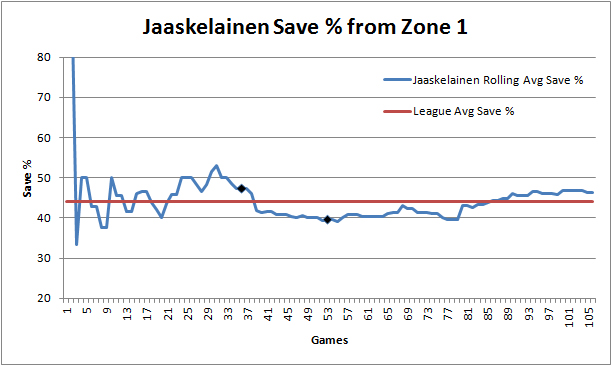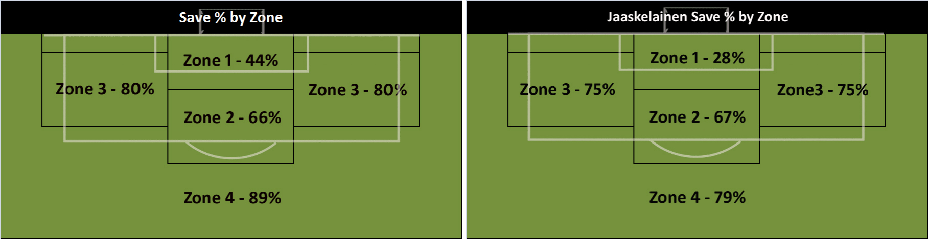 The below graphic shows the league average save % from different pitch zones and Jaaskelainen’s save %s at the point he got dropped in 2011/12: