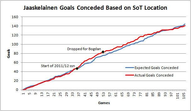 We can see that Jaaskelainen was concededing about the ‘right’ number of goals for the kind of shots he was facing all the way through the 2010/11 season. But then right from the start of 2011/12 he starts to concede more goals than expected until he eventually gets dropped for Bogdan. Looking at this chart the decision to bin the Finn looks correct. In real terms , the model suggests he had conceded 7 more goals than he should have done in 18 games.