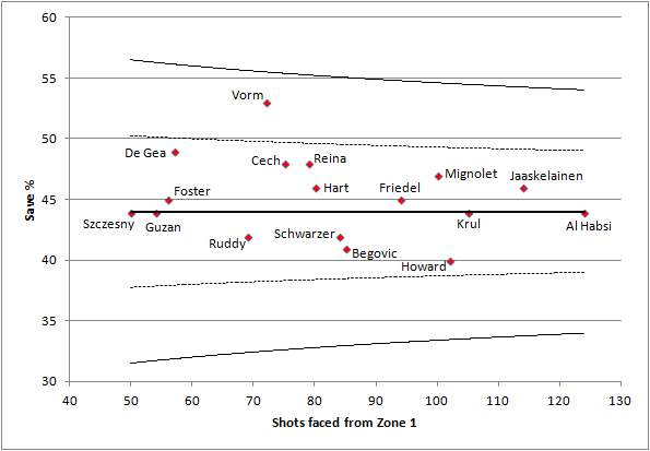 Vorm is way out on his own here. He’s not statistically significant – he’d have to be outside the 2nd curved line (2 standard deviations from the mean) for that. However, looking at the last two graphics, we’re not confident in saying that he’s showing no skill beyond that of his peers. Can anyone be that lucky? We guess we’ll find out over the next season or two. In any case, next time Swansea are on telly, look out for this.