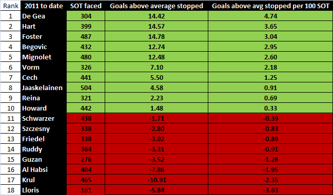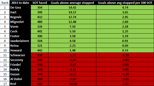 Yesterday we published our keeper shot-stopping rankings on Twitter. These dated back from the 2010/11 season and were fully up to date – apart from Ben Foster’s season with Birmingham.