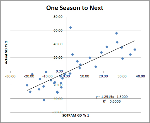 But what about SOTPAM’s predictive qualities? I only have two full seasons to go on but here’s how it looks for the 34 of 40 teams not relegated in that time, plotting SOTPAM goal difference for one season against actual goal difference the next: