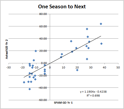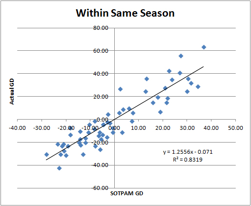SPAM is no better than TSR. In time, with enough seasons of data behind it, SOTPAM (and any other expected goals models fanalysts develop) could outstrip TSR, but let’s not get carried away just yet. While I remember it’s worth noting that SOTPAM excludes pens, direct free kicks and og’s but I’ve counted all those things for Actual GD.