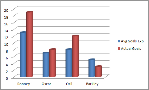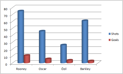 Mesut Özil is by far the least trigger happy of the four. He’s also by far the most efficient. Ross Barkley is firing shots off for fun for a relatively small goal return.