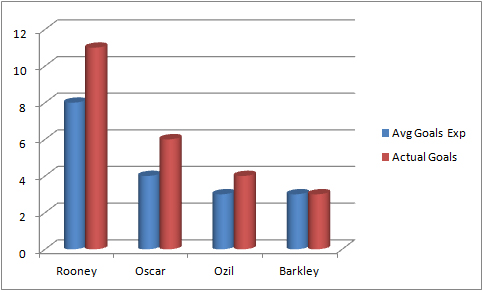 Both our chance creation and shot on target models allow us to put a figure on how the average shooter in the Premier League could be expected to perform given the same shot situations each of our heroes have found themselves in. Here’s the graphic: