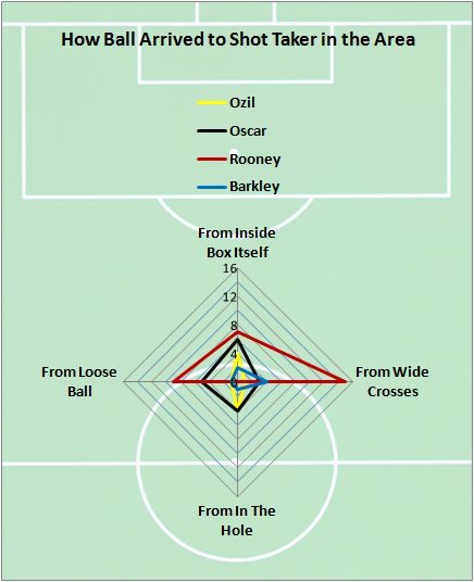Here we can see the styles of both player and team. Rooney’s attacking instincts cry out – getting into dangerous positions in the box to not only receive passes from inside it but also finding space where the loose ball drops. David Moyes’ penchant for getting the ball out wide for deliveries into the box is also heavily apparent in Rooney’s play. Oscar seems to reflects the natural balance in Chelsea’s attacking play, and Özil the narrowness of Arsenal.