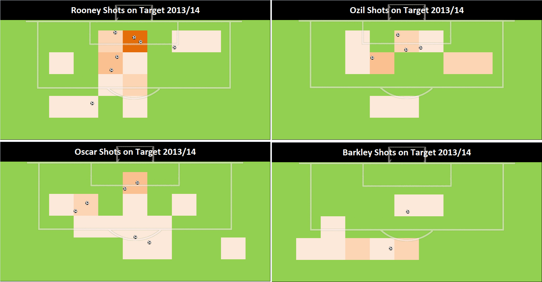 Of all the players here, Özil takes the least amount of shots from outside the box. He’s also getting his shots inside the box on target more too. Oscar has the all round shot pattern you’d expect to see from a classic No.10. Young Barkley speculates wildly.
