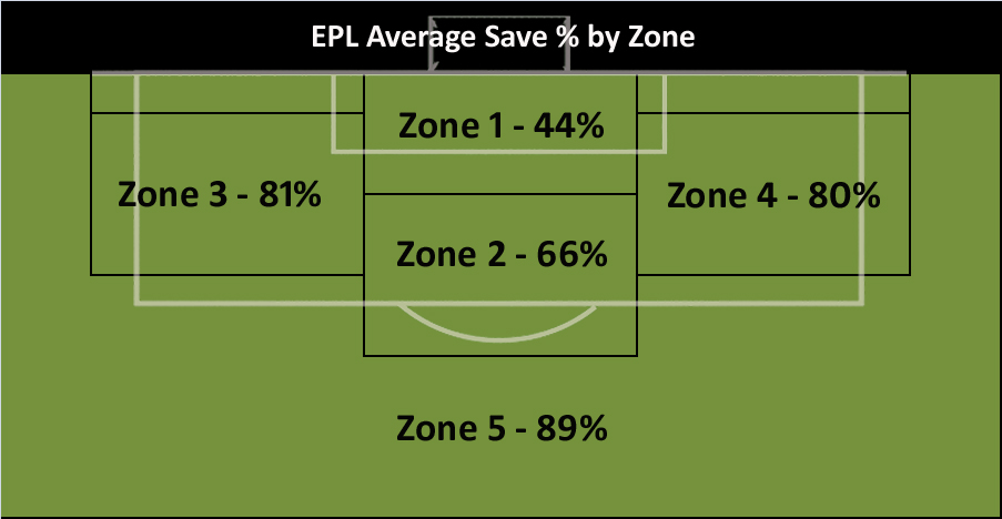 Below is the league average save% from each of the 5 ‘main’ zones. ‘Main’ zones group together smaller zones with similar save%s to give me bigger samples sizes to play with for other things.