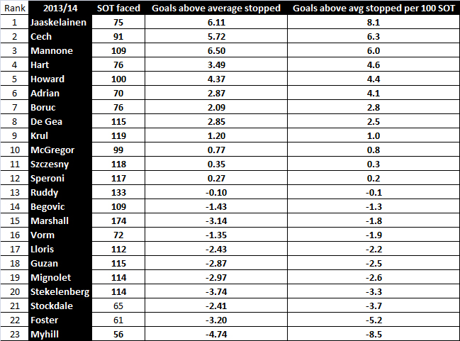 My keeping model is entirely based around the location of open-play shots on target keepers face. Taking that location data into account (adjusted for volume of shots) here’s how this season’s shot-stopping rankings look so far: