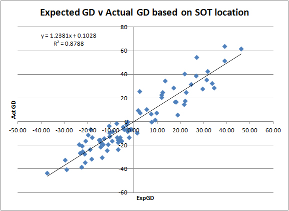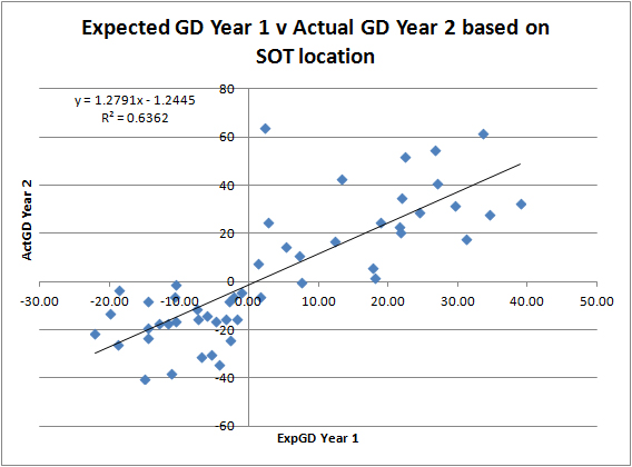 Again that Man City improvement in 2011/12 alone make the figures look worse than the overall trend might actually be. I expect to be able to show a better predictive value of ExpGD as more data is added to the model as seasons go by.