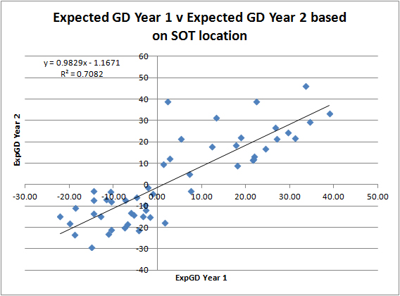 If I plot a team’s ExpGD one year against the one it’s posted the following year, this is what it looks like: