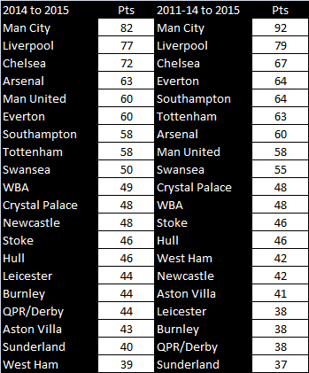 As the model currently stands, this is how it would predict the league table to look next season if I firstly just used last season’s numbers to predict it (left) or forecast it using 2011-14 numbers to predict it (right):