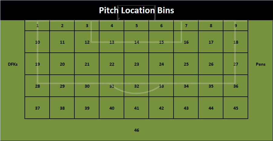 My current model uses only shots on target. The only other driver is where on the pitch the shot was taken from. I split shots into 46 ‘bins’. Direct free kicks and penalties have their own bins: