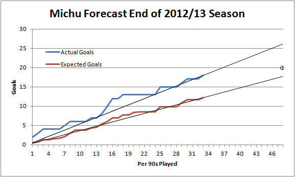 If I do all the things Omar talks about in the video above -take out penalties, standardise things by using ‘per 90 mins’ rather than per game to make things fair, I can knock up rolling plots for players to compare their actual goal and ExpG tallies. If I stop at the end of the 2012/13 season, I can simply do a linear forecast for each tally to see what each would have predicted for Michu this year: