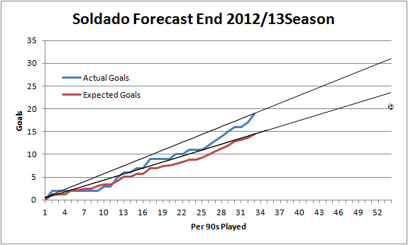 Again, basing a forecast on what did happen previously sees me wide of the mark. Basing the forecast on ExpG gets me a lot nearer where Soldado is actually at today. Remember, if we’ve seen that Rooney et al are pretty much in line with their ExpG tallies over the last few seasons, why would we expect the likes of Michu and Soldado to continue to smash defences up in the Premier League?