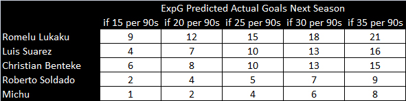 If I use all the data I have for these players and assume they follow ExpG lines, this is how the model predicts each player will do next season: