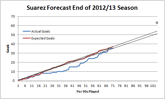 Unlike Michu or Soldado, Suarez is a player who was under-performing his ExpG for a long time. Using his ExpG tally at the end of last season, again we could have got nearer to predicting his current actual goal total than if we used his actual past performance.