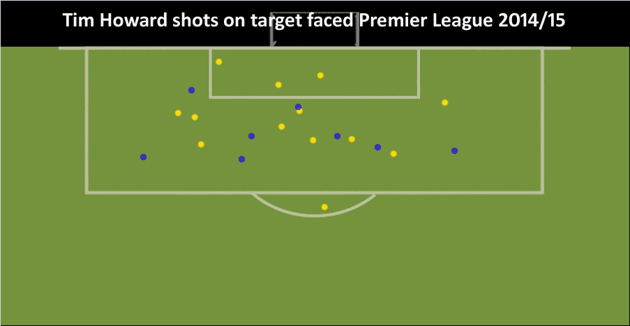 Everton have conceded 13 goals from 20 shots on target. That really takes some doing. Here’s how it looks visually (I resisted the urge to scribble wildly on a bit of paper). Yellow dots are shots that ended up in the net, blue dots are shots that Howard saved: