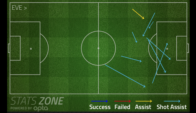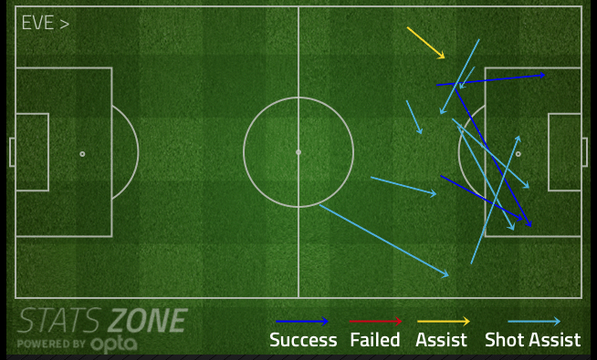 However, he’s not alone. If you take out Leighton Baines’ set pieces, only Samuel Eto’o is creating significantly more from open play (0.2 ExpA per 90mins) than Barkley is.