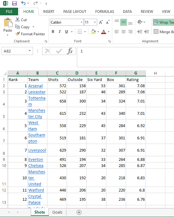 You need to repeat this process for each season to give yourself enough data to get a good sample size. I went 5 seasons back in a few minutes. Do it all in the same worksheets. Do 5 seasons and you should have 101 rows of data in each of your shot and goals worksheet.