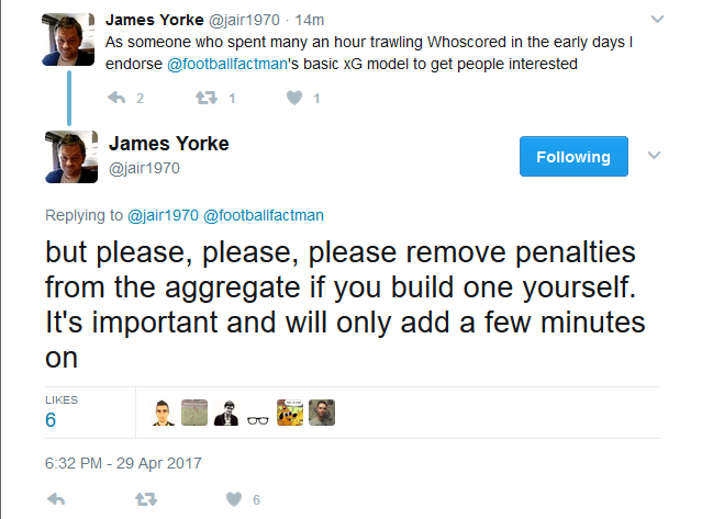 […] Riley’s xG model: https://differentgame.wordpress.com/2017/04/29/an-xg-model-for-everyone-in-20-minutes-ish/ WhoScored: […]