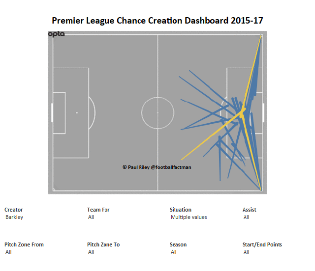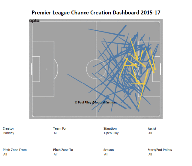 Essentially, Barkley and Sigurdsson just aren’t that good at consistent, high quality chance creation in open play. Neither get into, or pick people out in the box enough. Yellow arrows are assists: