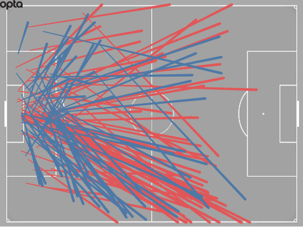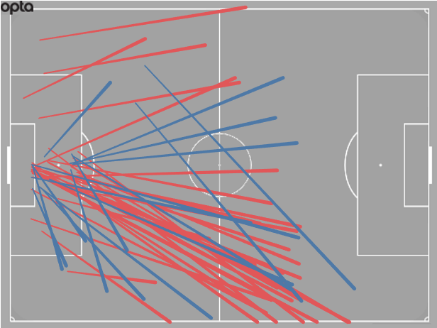 Pickford’s distribution map for the first three games. The red lines are unsuccessful attempts. Nearly everything beyond the half way line, then: