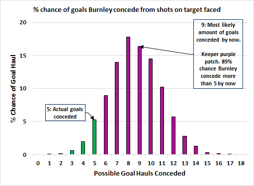 Burnley’s keepers Tom Heaton and Nick Pope have been massively overperforming so far this season. Burnley generally get bombarded by shots each week but their two shot stoppers have stood pretty firm. Below you’ll see the graphic showing all the possible outcomes of this according to my xG model. At some point, they’ll regress back to human levels: