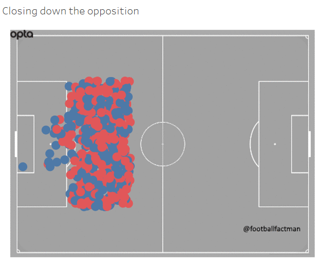 So the key things here in every example is the opponent being forced to pass back or forced into misplacing a pass. The video shows you this is what happens when defenses apply pressure. Pour moi, this gives you more data points than fairly rare events like tackles or interceptions. Pour moi, it’s a more realistic measure of pressing than ones I’ve seen around.