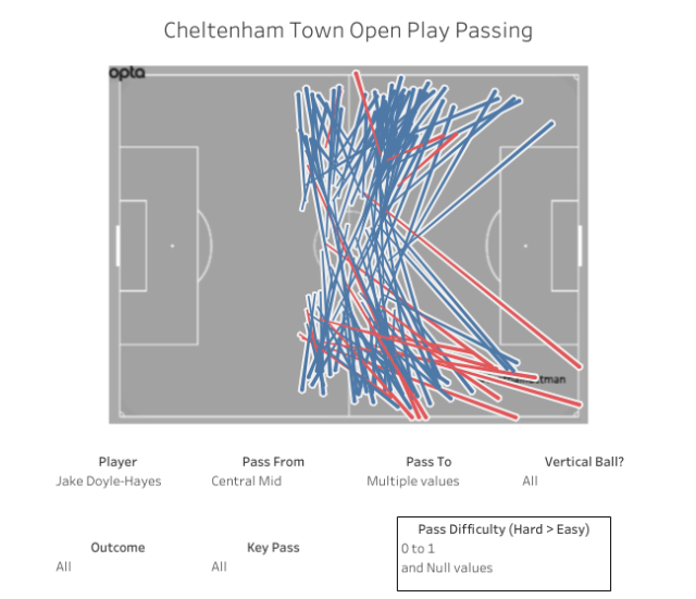 Cheltenham rank 3rd of 24 in League Two for open play passes per game, and try and build from the back more than most. However, they often get bogged down in midfield with the first port of call to shuffle the ball wide rather than try anything vertical.